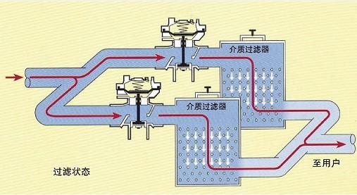過濾狀態(tài):來水通過控制閥進入過濾器單元,過濾后水進入系統(tǒng)出水管。